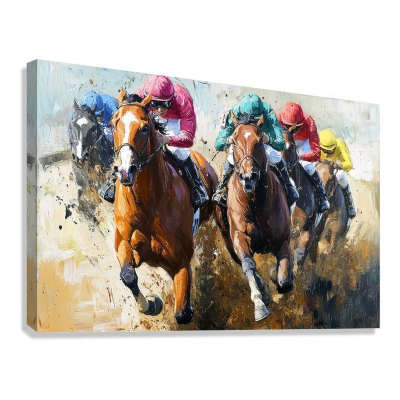 Horse racing fans and art collectors will immediately recognize the authentic racetrack atmosphere. The vibrant jockey silks in pink, teal, red, and yellow stand out against the earthy tones of the dirt track, creating a visually striking scene that embodies the speed, strength, and competitive spirit of thoroughbred racing. Every brushstroke conveys motion and urgency, making viewers feel the thunder of hooves and the electric tension of a close finish.