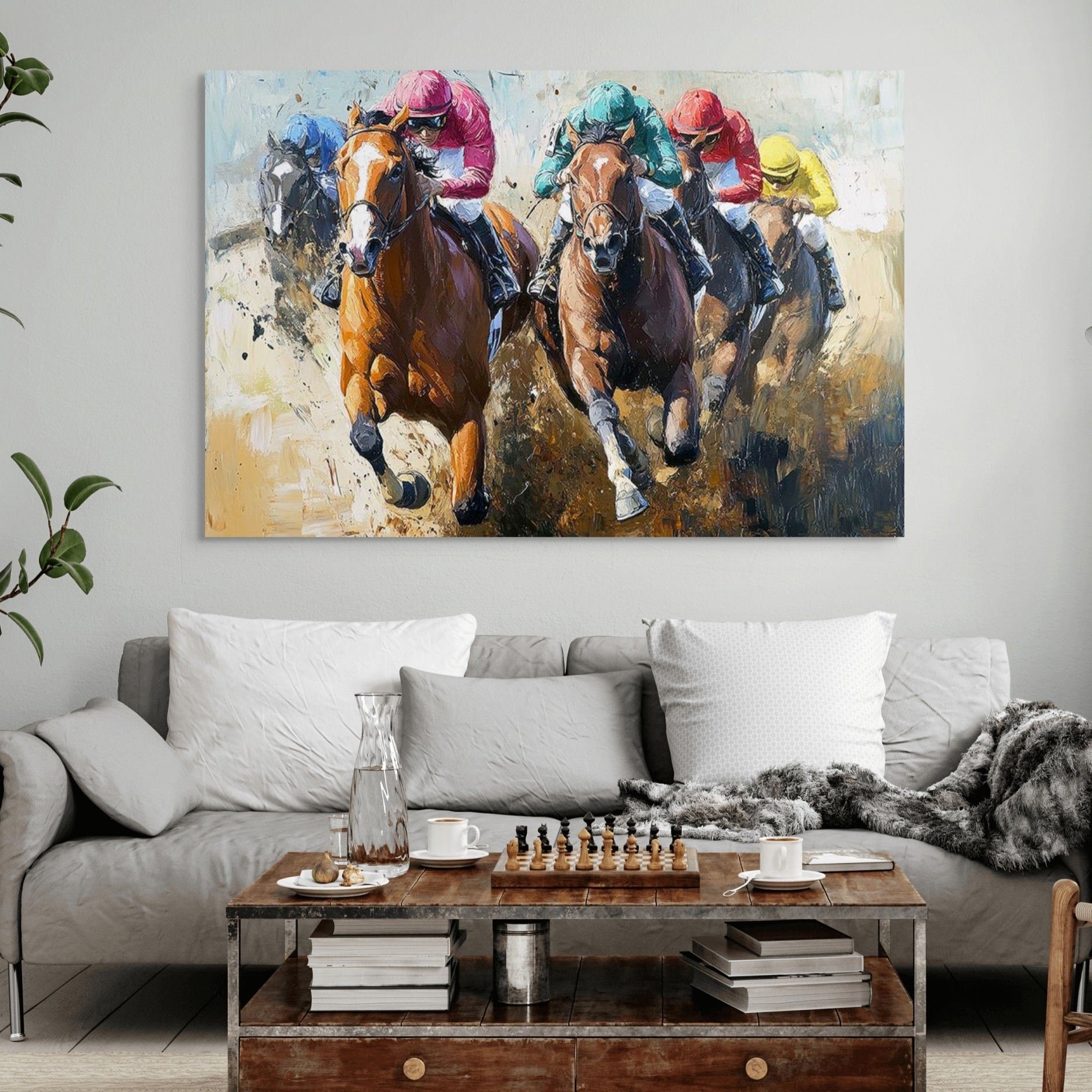 Whether you’re decorating a game room, study, or equestrian-themed space, this painting serves as a powerful tribute to the sport of kings. It celebrates the unbreakable partnership between jockey and thoroughbred during those crucial final strides when strategy, heart, and raw speed determine the winner.