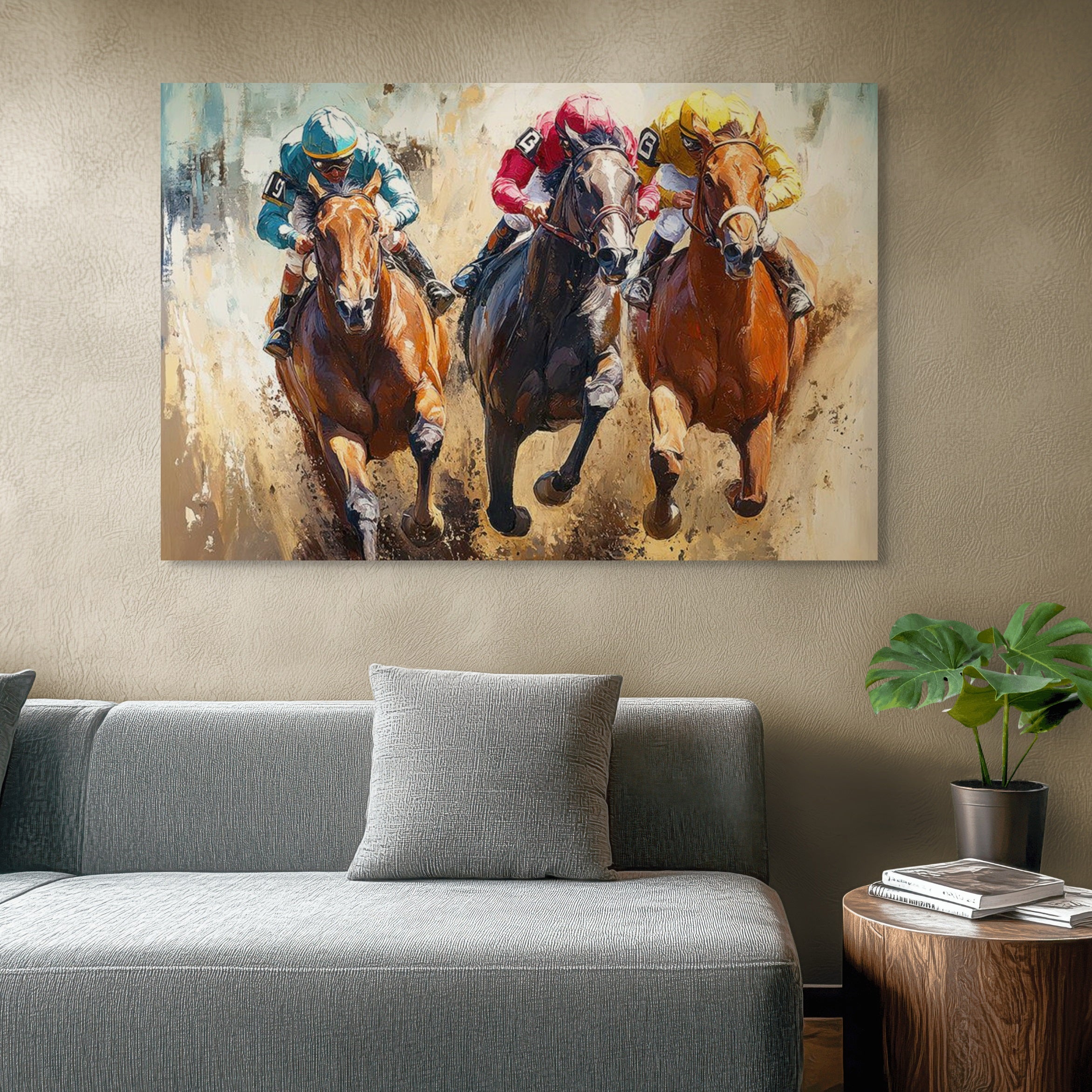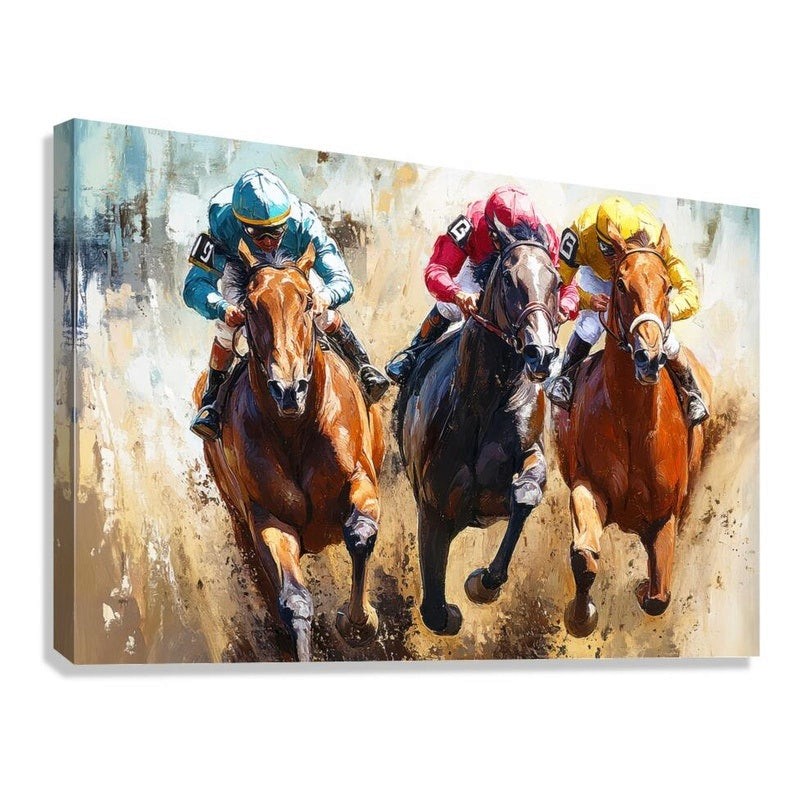 What makes this original horse racing painting so compelling is its intimacy. There are no grandstands here, no distant panoramas — just three horses and three riders, filling the canvas completely, close enough to see the focus in their eyes and the tension in the reins. It is an immersive, visceral composition that places the viewer right in the middle of the action, feeling the heat and urgency of a championship stretch run. For anyone who has ever stood trackside and watched a field come thundering home, Last Push will resonate on a deeply personal level.