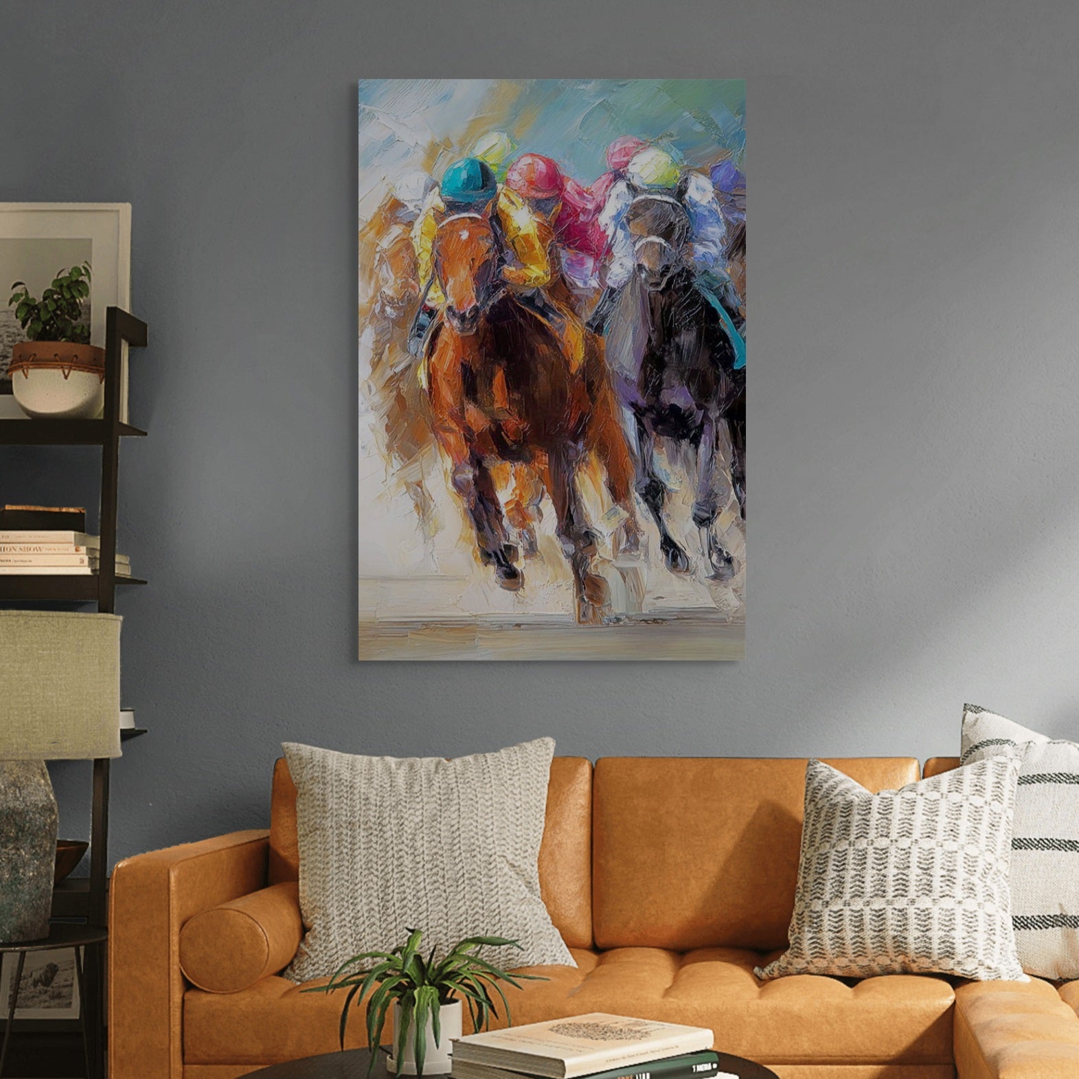 The painting also speaks eloquently to the extraordinary bond between jockey and thoroughbred that defines elite racing. Each pairing in this composition tells its own story — the quiet determination of the teal rider, the fierce intensity of the red, the bold confidence of the yellow — yet together they form a single, unified image of competition at its most exhilarating. This is equestrian sports art that honours not just the spectacle of the race, but the courage, training, and trust that make it possible.
