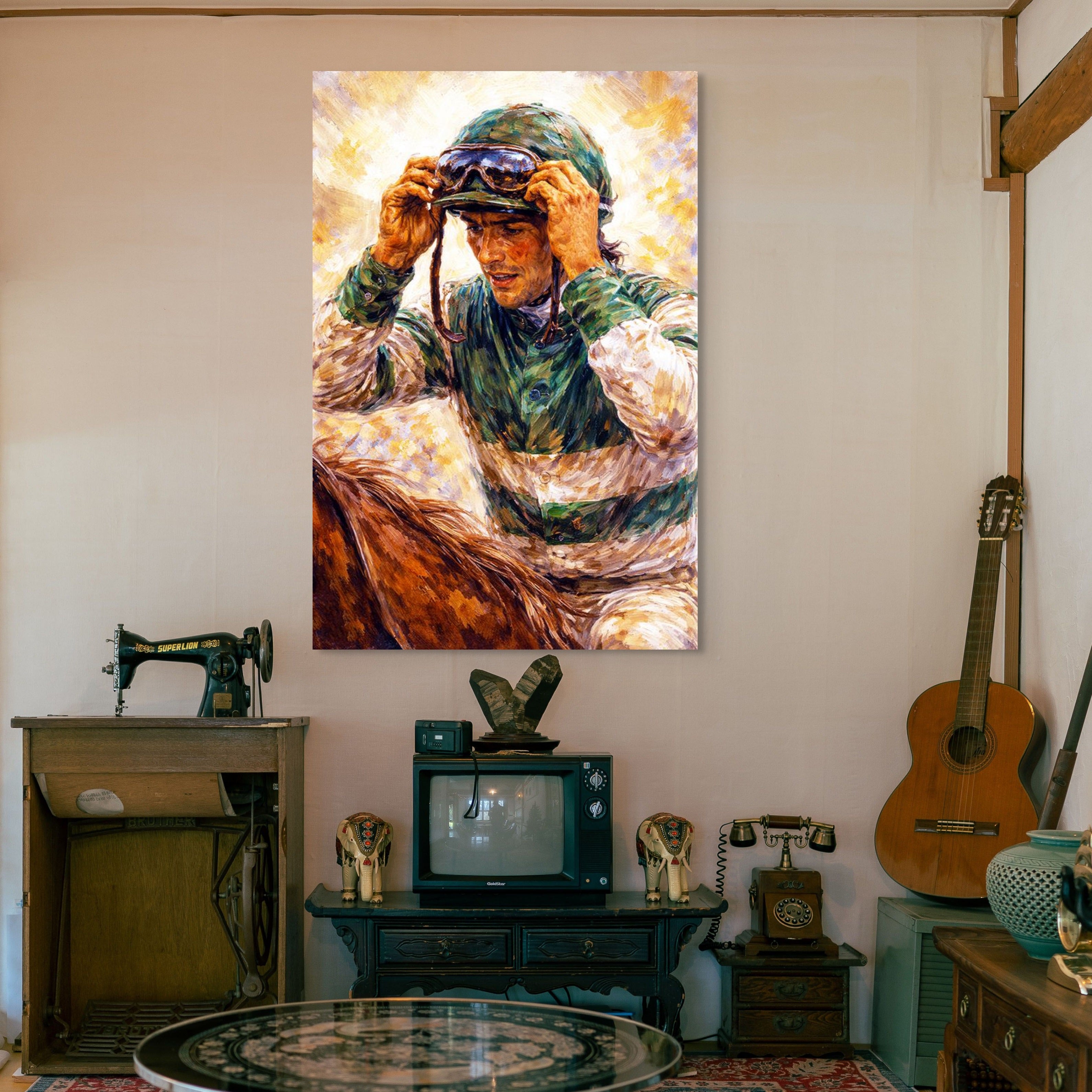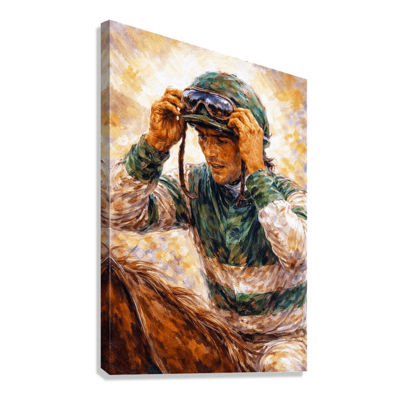 A powerful horse racing painting capturing a jockey in a moment of intense pre-race focus. The textured brushwork and rich tones highlight determination and discipline before the break. Set against a luminous backdrop, it reflects the mindset behind every great race. A striking piece that brings energy and purpose into any home.