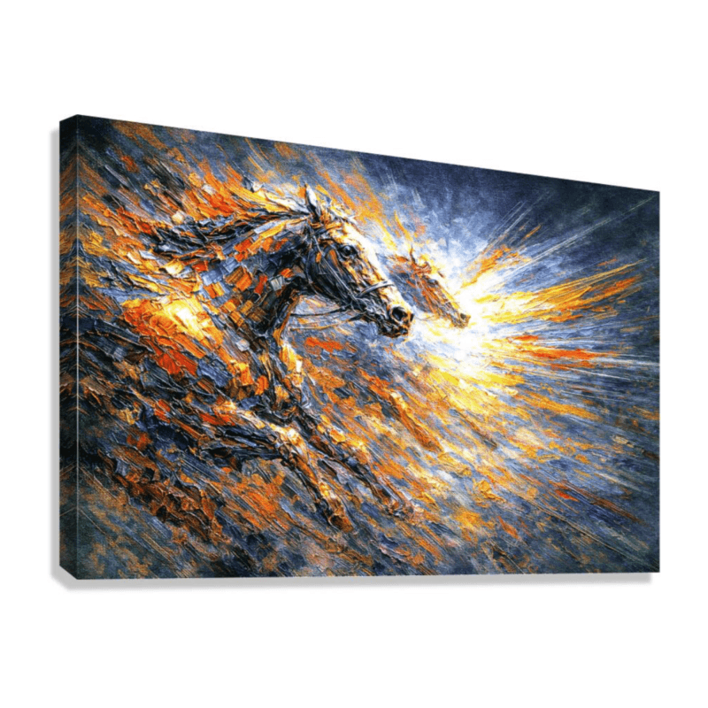 Rendered in a dynamic mosaic of fiery brushstrokes, the lead horse surges forward with incredible drive, its muscular frame sculpted in vibrant oranges, golds, and deep blues, while a brilliant burst of golden light erupts from its head and mane – symbolizing the ultimate kick and final surge of speed that separates champions in the homestretch.