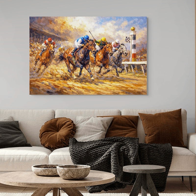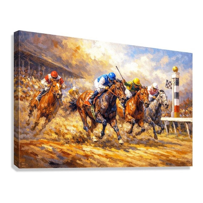 This powerful painting captures the heart-stopping moment of the final surge in a thrilling Thoroughbred horse race. Four determined horses and jockeys are locked in a fierce stretch drive, galloping flat-out toward the finish line on a dirt track. In the lead, a jockey in blue silks urges his dark bay forward while a rider in green and yellow silks battles on the outside. Dust flies as the field surges past the winning post, with the checkered flag waving and the grandstand roaring in the background. Every brushstroke conveys the speed, power, and raw intensity of a classic photo-finish battle in the sport of kings.