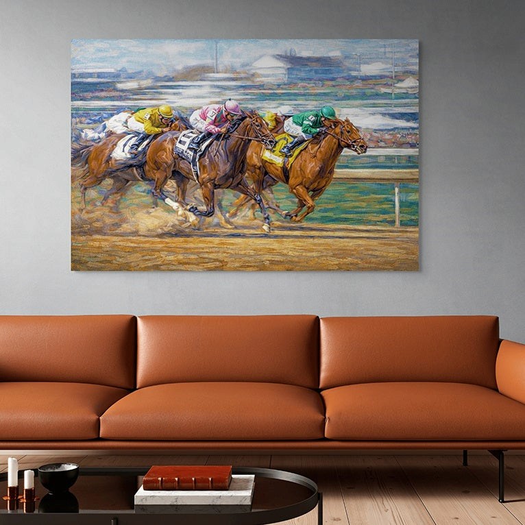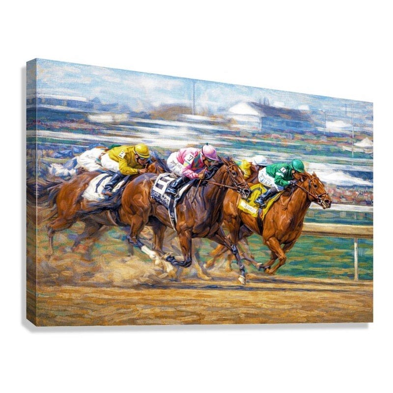 Ideal for racing enthusiasts, trainers, owners, and art lovers alike, this painting brings the adrenaline of the racetrack into your home or office. It serves as a powerful reminder of those unforgettable stretch battles where skilled jockeys keep their horses composed and powerful all the way to the wire.